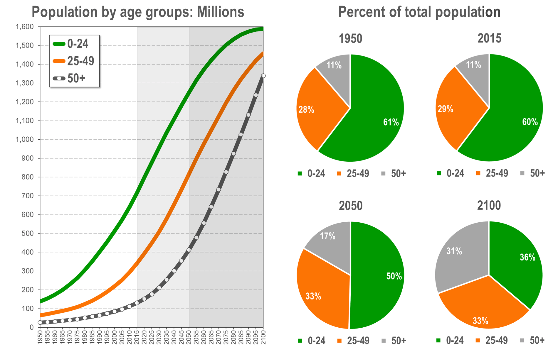 As a consequence of todays young population and the still relatively high fertility, Africa will see an explosion in the number of children and young people over the next few decades: By 2050, Africa will have around 1.25 billion children and young adults under age 25; and by the end of the century Africa will most likely have almost 1.6 billion children and young adults aged 0 to 24 years.