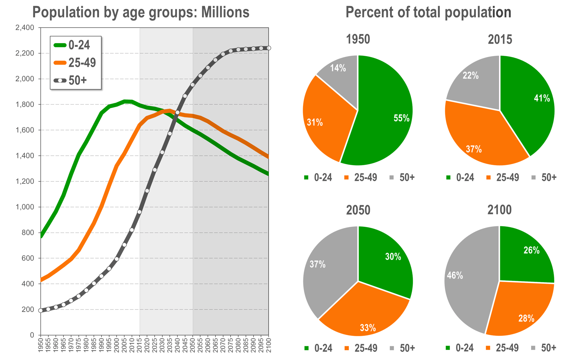 The absolute number of people age 50 and above has already increased from 119 million in 1950 to 282 million and will peak around 2040 with 332 million. Then it will slowly decline to 302 million in 2100.